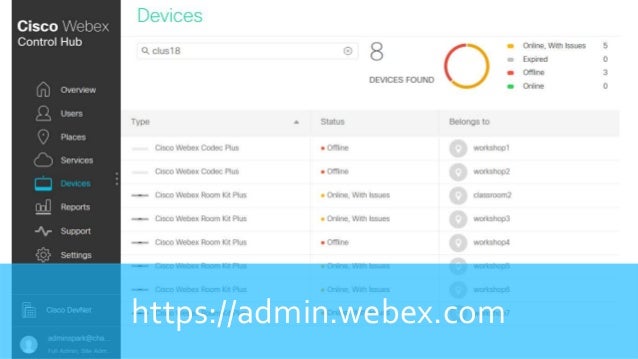 Cisco webex control hub api. Cisco webex control hub offers a holistic view of all your cisco webex services. Use the events api endpoint to access activities after they have occurred. You can view baseline data on your organization s network when using webex services with the webex monitoring service in cisco webex control hub. The integration between users in the directory and webex control hub uses the system for cross domain identity management api scim is an open standard for automating the exchange of user identity information between identity domains or it systems.